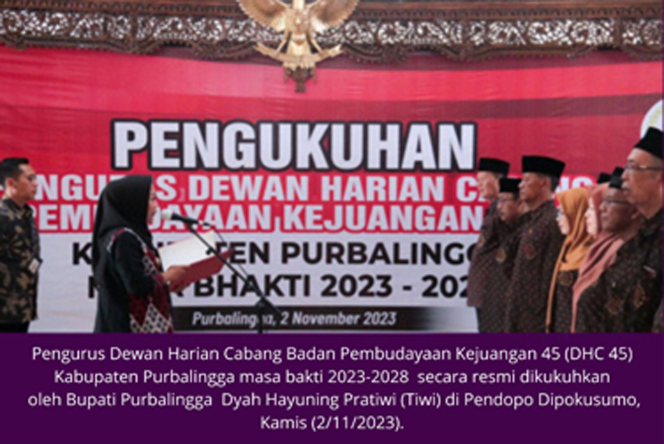 Pengurus Dewan Harian Cabang Badan Pembudayaan Kejuangan 45 (DHC 45) Kabupaten Purbalingga masa bakti 2023-2028 secara resmi dikukuhkan oleh Bupati Purbalingga Dyah Hayuning Pratiwi (Tiwi) di Pendopo Dipokusumo, Kamis (2/11/2023).